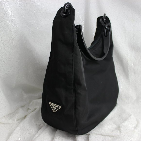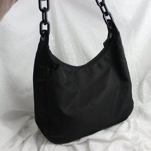 Black shoulder bag with silver logo and plastic chain handles. This Prada tote is surprisingly spacious and has the 'it' crescent shape of the very sought after bags at the moment.