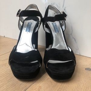 Great condition, barely worn. Black suede Prada sandal. Adjustable straps. Five inch heal.