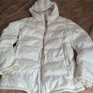 White Prada Puffer. Down filled. Very warm. Has a built in moneybelt inside to keep your valuables safe. Hood has buttonholes to add fur trim. Toggles on cuffs and bottom to keep out the wind. Bust measured laying flat, one side, is 18", hip 19". Overall length is 29". Sleeve length is 27". From a smoke free home.