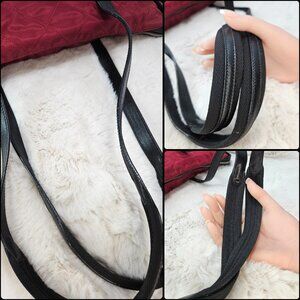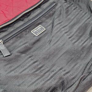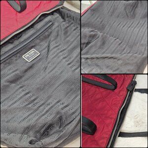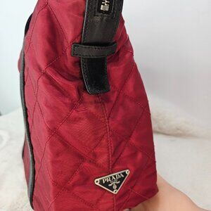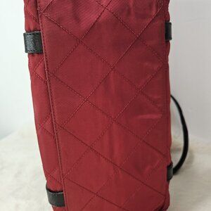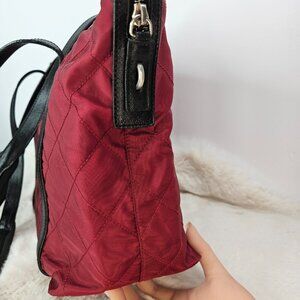 Crafted from durable, water-resistant Tessuto nylon in a rich burgundy or deep red hue, it features a timeless diamond quilting pattern and sleek black leather (or patent leather) trim and handles for a sophisticated contrast.