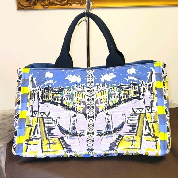 Fabulously rare and beautifully maintained vintage 2004 Prada Limited Edition St. Venez (Venice) Canapa Tote. This graphic canvas tote features dual rolled handles, tonal stitching, two generous interior zip pockets and one small interior slip pocket. Poshmark will authenticate all items over $500 and we can assure this is a true Prada Canapa. As clean as a brand new bag with no stains, no scuffs and no handle wear. Hate to part with this but we are moving and need to downsize.