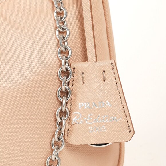 Circa 2019, this Re-Edition 2005 bag from Prada is crafted with the designer's Tessuto nylon in a Cammeo beige, and features tonal saffiano leather trim, silver-tone hardware, a detachable and adjustable logo-print woven nylon shoulder strap with a removable zipper pouch, a removable chain handle, a Re-Edition keychain, and the iconic enameled metal triangle logo on the front. The top zip closure opens to a logo-jacquard-lined interior that is perfect for fitting your everyday essentials.