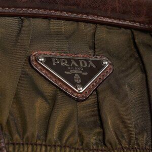 This Italian-made shoulder bag from Prada's 2007 Resort collection is crafted with the designer's Tessuto Gaufre nylon in an army green, and features dark brown leather trim, silver-tone hardware, two braided leather handles, a structured frame, buckled detailed straps, and a removable tag. Secured with magnetic snap closures, the top opens to a black logo-jacquard-lined interior containing a slip pocket, and a zip pocket.