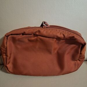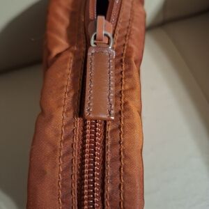Prada rust nylon zip pouch. Clean, minimalist design with metal logo plaque. Secure top zipper and compact shape for everyday carry. Stylish rust color complements casual and dress looks. Bought from Holt Renfrew come with receipt, no box. Made in Italy.