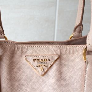 Prada Saffiano Lux Leather Tote Nude Pink size Small. Condition is Pre-owned. Some wear on the handle and bottom of the bag. Some splitting on the key ring strap. Logo interior lining in perfect condition, 3 interior compartments with centre zip. Purchased at Holt Renfrew. $2800 original retail. Includes authenticity card, key-ring and clochette.