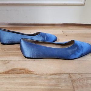 Slate satin Prada flats with tonal stitching and stacked heels. Purchased them on the Real Real a few years ago for my wedding and I didn't wear them in the end. There's a few little stains on the right shoe as shown in the pictures. Comes with the bag but not the box.