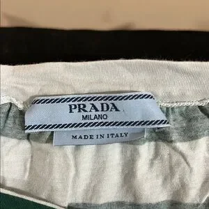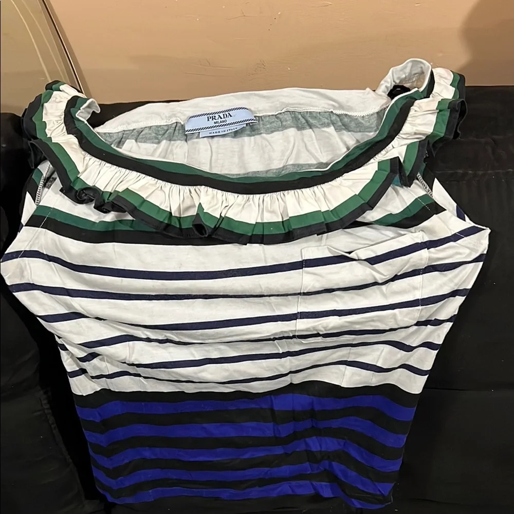 Chic Prada top with ruffle details. Features black, green, white, and blue stripes.