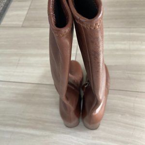 Tall, caramel brown leather boots, size 38.5. Soft supple leather and rounded toe. Heel height is 6 cm or 2.25" and calf circumference of 36 cm or 14.5". Concealed zipper closure at ankles; zipper length of 19.5 cm or 7.5". Very light wear.