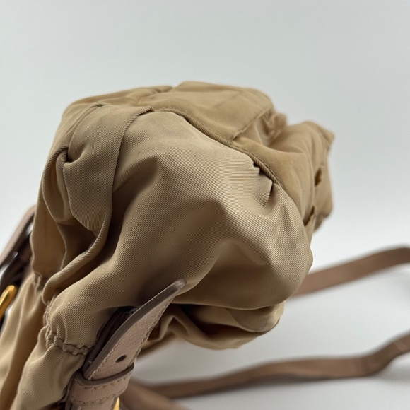 Classic Prada ruched nylon satchel with double handles and detachable shoulder strap. Detailed with gold-tone buckles, top zipper closure, and signature Prada logo at front. Lightweight yet luxurious, perfect for everyday chic wear.