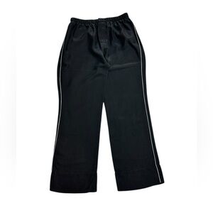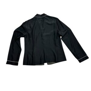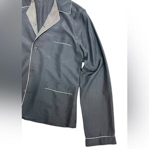 Luxury in its most effortless form. This authentic vintage pajama set from Prada is crafted in 100% silk and made in Italy. Classic navy with contrast white piping, the shirt features a notched collar, chest pocket, and two front flap pockets. The matching pants have an elastic waistband and tailored cuffs for comfort and elegance.