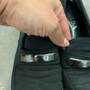 Chic black flats by Prada. Sleek design with a modern touch. Ideal for versatile styling.