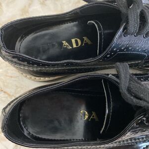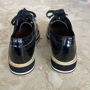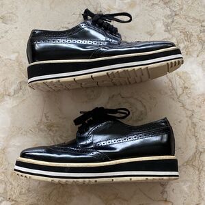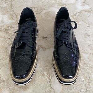 In excellent preowned condition classic PRADA black patent leather brogue wingtip platform Oxford shoes.