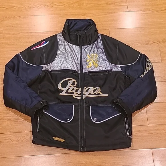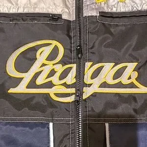 Stainless blue racing jacket from the UK racing brand Praga. With double zippers and gold/yellow emblems.