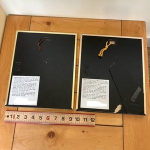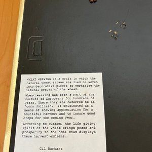 Set of 2 vintage hand crafted wheat weaving framed pictures. One of a prairie grain elevator, and the other of a traditional barn. Made in Wetaskiwin, Alberta, Canada by Gil Burkart, each one has artist's information on back of frame. Frame size is 9x11". Good pre-owned condition: metal frames have a few scuffs/scratches from display/storage. Roof of barn has curved slightly away from the brown fabric backing - see close-up photo.
