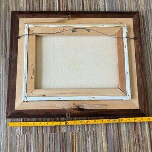 Original oil painting of a prairie grain elevator with a serene pond in the foreground. Signed R. Jancsek and dated 1987 in the bottom right corner. Art size is 12" x 16", framed without glass, frame size is 17" tall x 21 wide. Pre-owned condition: frame has some wear from display/storage (small indents/scratches to frame surface), beige matte has discolorations on the top and bottom edges (see close-up photos).