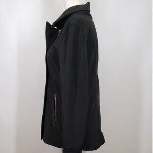 This jacket helps you brave the elements with a performance soft shell treated with durable water repellent and bonded to a cozy fleece lining with a waterproof membrane. An asymmetrical row of metal-look buttons complements the flattering cut.