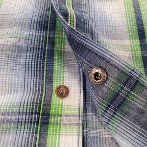 Prana Shirt Men XL Blue Green Madras Plaid Silver Snap Casual Button Up Western