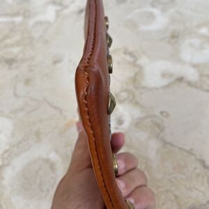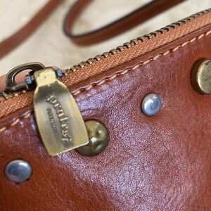 Wonderful little leather bag from Pratesi Firenze, classic versatile tan tone with silver tone and brass studded detail, adjustable strap, and zippered top.