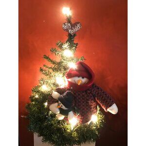 This festive pre-lit mini Christmas tree adorned with a snowman family and a "Happy Holidays" sign brings warmth and cheer to any setting. Its compact size is ideal for small spaces, and the charming snowman family complements the holiday decor.