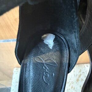 This is a pair of pre-loved Joie black suede sandals with a black fringe across the toe, and a strap at the ankle. It is a size 37 or 6.5. It is in excellent used condition. Only worn a couple of times. The right shoe still has the price sticker on the inside of the shoe. Heels measure 3.75".