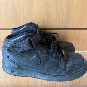 These are a pair of used Nike men's Air Force Mid '07 Triple Black Leather High Tops in size 9. In good used condition, with some creasing on leather and wear on the hook and loop closure. They need a good cleaning and shoe shine, but there's lots of life left in them. Perfect for school, or just chilling out.