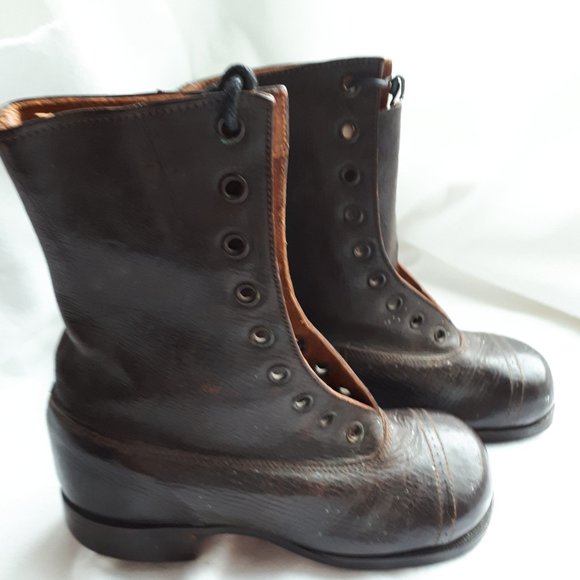 Brown leather boots from late 19th/early 20th century... appear to be new and never worn. In excellent shape, just missing laces. Beautifully handcrafted in leather with linen lining. Not sure of size but measure 5.5 inches in length and height. Manufactured by HH Crosby Co, Ltd, Hebron Nova Scotia, marked on sole.