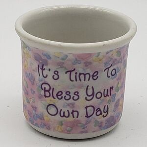 -Sweet ceramic candle holder with beautiful girl on front and "It's Time To Bless Your Day" verse on the back surrounded by beautiful pastel coloured flowers