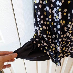 With a v-neck and faux-wrap style, this dress also has 3/4 length sleeves. Navy with yellow and white tulips, the pattern is flattering and works well with curves. measurement in pictures. spring summer business casual date