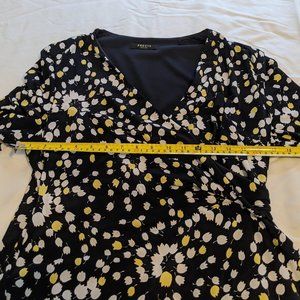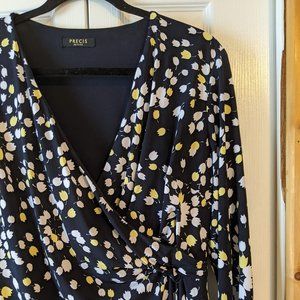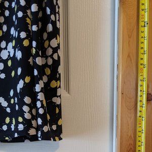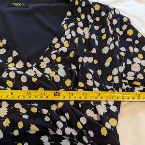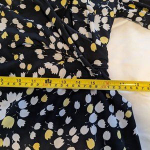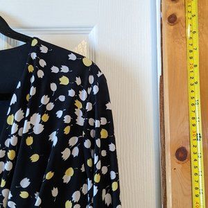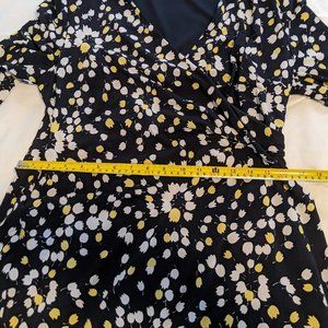 With a v-neck and faux-wrap style, this dress also has 3/4 length sleeves. Navy with yellow and white tulips, the pattern is flattering and works well with curves. measurement in pictures. spring summer business casual date