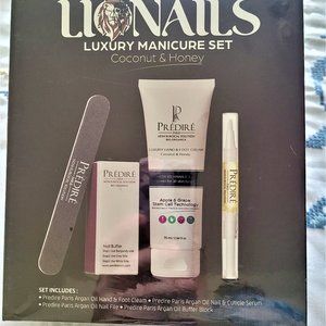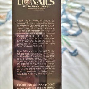 Lionails Luxury Manicure Set Coconut and Honey 4-Piece Set: Predire Paris Moroccan Argan Oil Manicure Set is a stimulating beauty treatment for your hands and nails. With highly nourishing and restorative ingredients of Moroccan Argan Oil, our Manicure Set will help to improve dryness, chipping and cracking while protecting your hands, nails and cuticles. Time to give your hands and nails the pampering it needs with our elite Moroccan Argan Oil Nail Kit. Argan Oil is a precious and rare oil that has supplied radiance and nourishment to skin and hair for centuries. "Liquid gold" as it is lovingly referred, Argan Oil is organically grown and rich in vitamin E and essential fatty acid. It is light-weight and also said to have restorative and age-defying effects, making it one of the most ingredients effective into introduced the beauty industry to date.