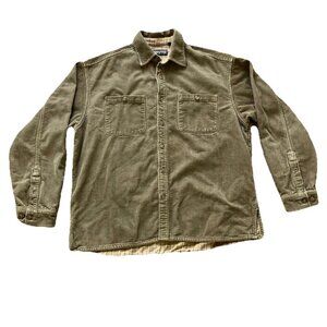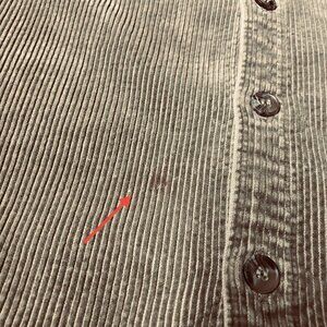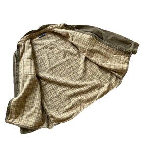 Prefab brand tan corduroy shirt jacket has plaid flannel lining. Button front closures, two chest pockets. Men's size "Medium" - see below for garment measurements. 100% cotton, machine wash or dry clean. Pre-owned condition: some fading to fabric from normal wash/wear. Rivet on left side of split hem has pulled away from the seam, has a small spot between the bottom two front buttons (see close-up photos).