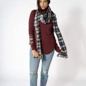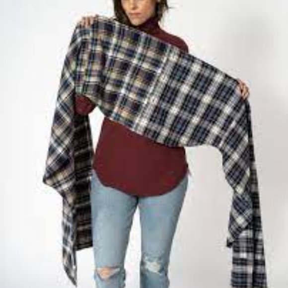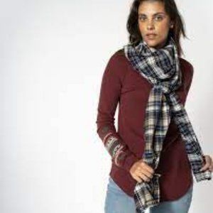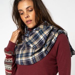 Ashley scarf is contrasted with vintage flannel panels. Each scarf is carefully curated with the perfect mix of colours and patterns.