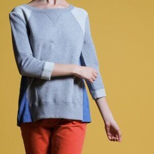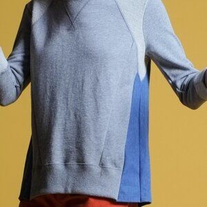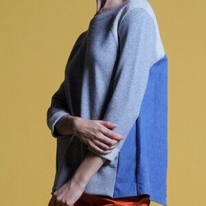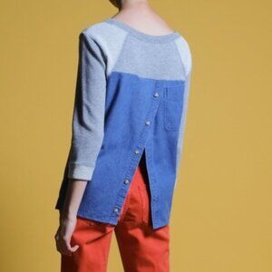 NEW WITH TAGS. This beautiful cozy crewneck sweater is made from upcycled fabrics and features a sweatshirt style in the front with an open back crafted from vintage denim button downs! Seriously unique piece. These are high quality sustainable, Made in Canada pieces and are a selloff from a boutique closure.