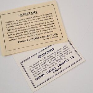 Premier Cutlery Co (Toronto) set of 6 steak knives, made in Sheffield England of stainless steel. I think the handles are some kind of plastic. They have never been used. Premier closed in 1955 so these have to be from before then.