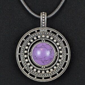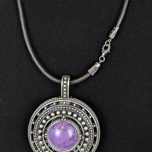 This byzantine style pendant necklace by Premier Designs has a lobster clasp closure made of sterling silver (stamped 925) and a "chain" made of a black cord. The pendant, which is stamped with the PD logo inside the bail, has a hinge at the top of the bail, allowing it to open from the back (magnetic closure) and be moved from one "chain" to another without issue. The pendant is round and made of a silver tone metal (though not likely sterling silver). There are layers of dot details on the front and back, with a plastic "crackle" purple stone on the front and a metal floral pattern on the back, meaning it can be worn with either side facing outwards.