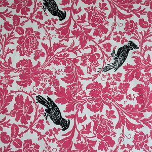 This is a lovely piece of decor/home fashion fabric from Premier Prints. It is heavy cotton and has a white background with a stylized design of deep pink florals with black birds. It is 55 inches wide and 1 yard in length - perfect maybe for a pillow cover, table topper . . .