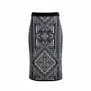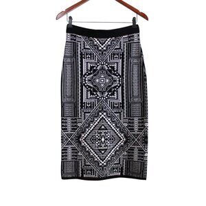 A pencil skirt in black and white with a tribal-inspired geometric pattern. It’s an unlined knit with some stretch. Pull-on style, elastic waist concealed under ribbed-knit trim. Perfect for spring, fall, and winter. Gently worn, great condition.
