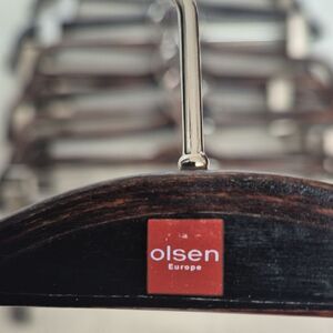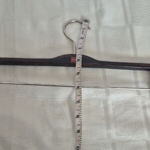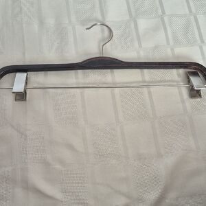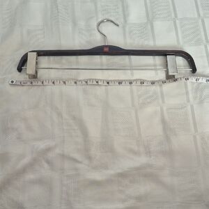 Enhance your closet with premium dark wood hangers that feature sturdy clips. These hangers are ideal for organizing your wardrobe with style. The hangers are suitable for pants and skirts. Although there is some wear on the wood, they are usable and in excellent condition.