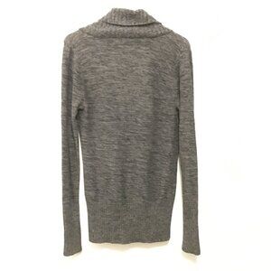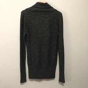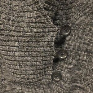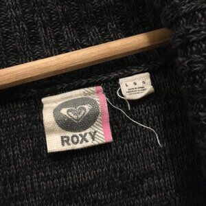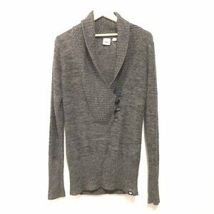 Good preowned condition, cozy, knit, cotton blend, marled sweater in tones of grey, black, with long sleeves, a slouchy cowl neck and 1/3 button up feature at the chest by Roxy. Popular at the end of the Y2K era. Large ribbed band on the bottom hem, and ribbing on the cuffs and neck for timeless fit.
