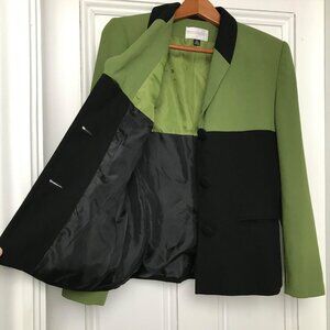 Stunning green and black women's business blazer!! In great preowned condition, however there is a small stain on the front left sleeve. Womens size 6, button closure and collared. There are shoulder pads on both sides of the blazer.