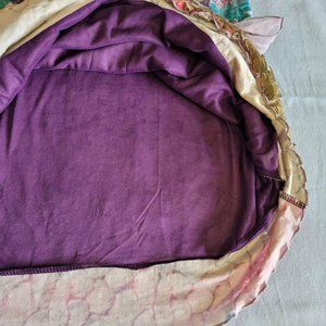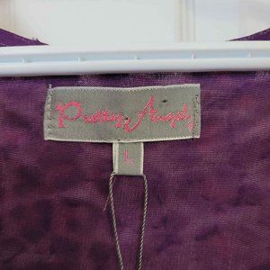Outer dress is a soft distressed silk open pattern with flowy ruffle accents that stretches in every direction. It is somewhat form fitting.