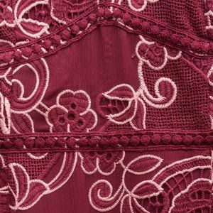 Really fun embroidered, sleeveless dress in a rich burgundy red with pink stitching. Different textures and fabrics including mesh and crepe. Fits the body beautifully, looks much better on than on the hanger. Falls just around the knee and zips in the back. Worn once, forgot to open the kick pleat.