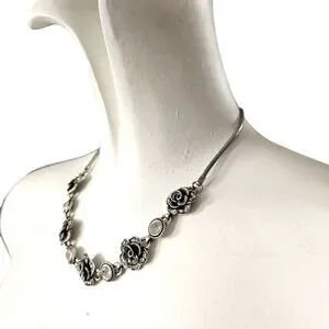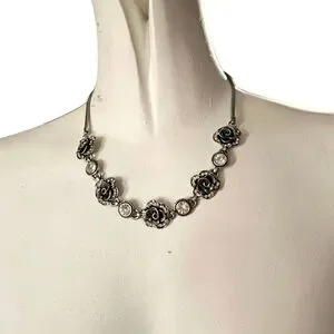 This show piece necklace features a floral pattern and lots of bling. A unique piece to add to your wardrobe.