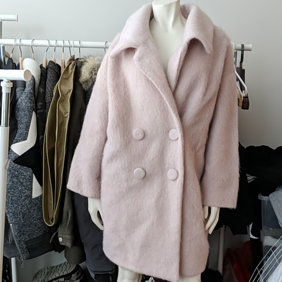 Adorable baby pink fuzzy coat by DRWCYS. Lined inside with same baby pink. Very pretty large pea coat style buttons.
