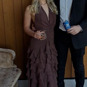 Pretty Little Thing Chocolate Plunge Ruched Frill Detail Maxi Dress