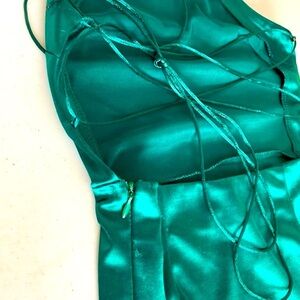 Featuring an emerald green satin look material, a high neckline and strappy back design, style this mini dress with some strappy heels and hoop earrings.