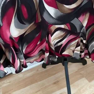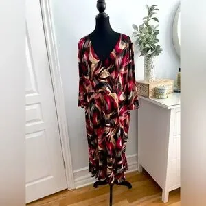 This is the dress that when you wear you get lots of compliments. Red, pinks, grey and black swirl pattern, it is very flattering. Nice stretch. 3/4 sleeve. Purchased at Winners.
