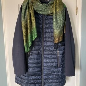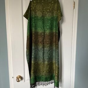 Pretty variegated green pashmina. Mix of green tones. As new. Measures 78” long, 27” wide with 2” fringe. $15