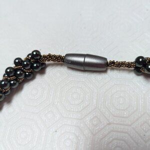 Add a touch of vintage charm to your outfit with this beautiful hand-beaded necklace. The necklace features stunning Broncetone and Emerald Green beads that are sure to catch anyone's eye.