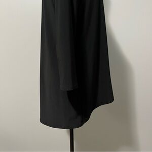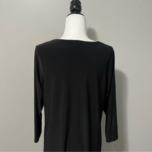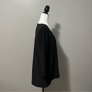 Excellent condition. Black 3/4 sleeve tunic with hi-Lo hemline. Fitted sleeve & upper body, flare to bottom. Made in Canada.